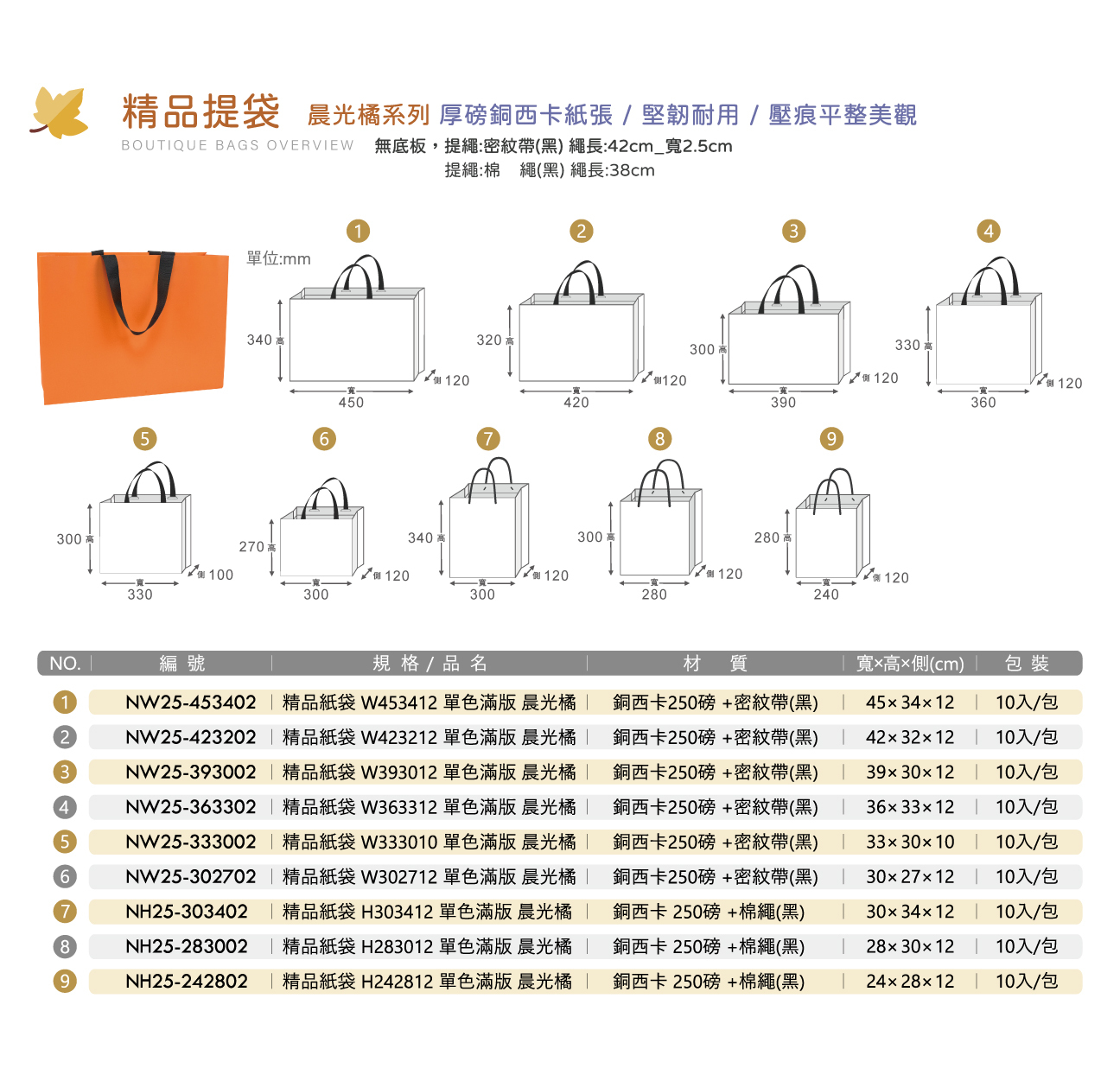 厚磅|精品紙袋 W393012 單色滿版 晨光橘 寬39高30側12cm (10入)_NW25-393002